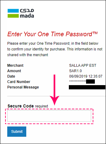 6- سيصلك رمز سري مؤقت إلى رقم جوالك المسجل لدى البنك, قم بكتابة الرقم في هذه الخانة ثم الضغط على ارسال و بعد ذلك سيتم سحب المبلغ من بطاقتك: